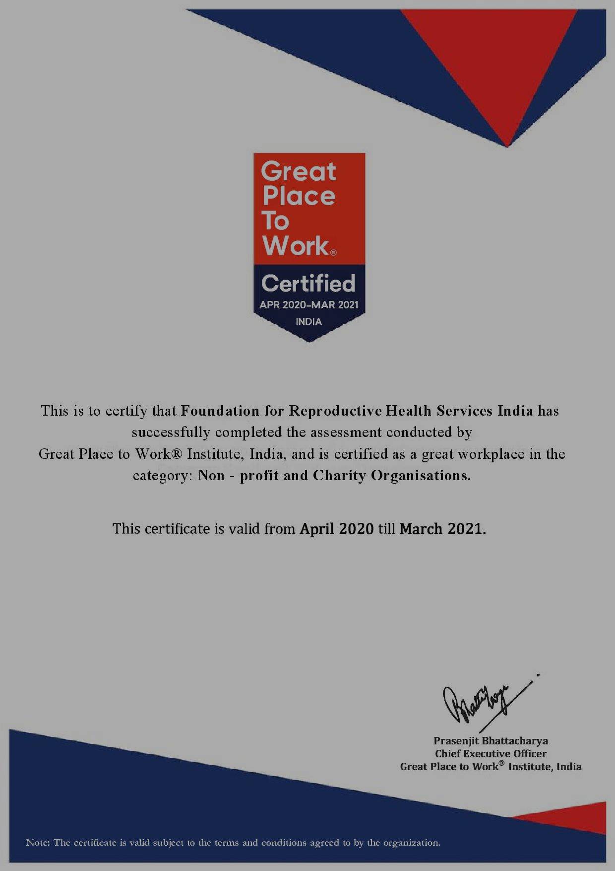 FRHS India has been awarded this certification by the Great Place to Work Institute following a rigorous employee survey and a culture survey. Over 89% of our staff participated in the survey. The employee survey scored the organisation on five dimensions - Credibility of Management, Respect for People, Fairness at work place, Camaraderie between people and Pride in our work. With an overall trust index score of 85, once again we have proved that we are indeed a great place to work!