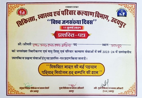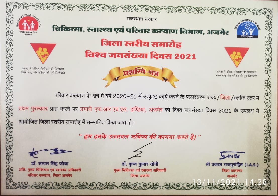 Proud to share that FRHS India been awarded First Prize in Ajmer by the Rajasthan State Government on the occasion of World Population Day for excellent work in Family Planning and Welfare on a District level.