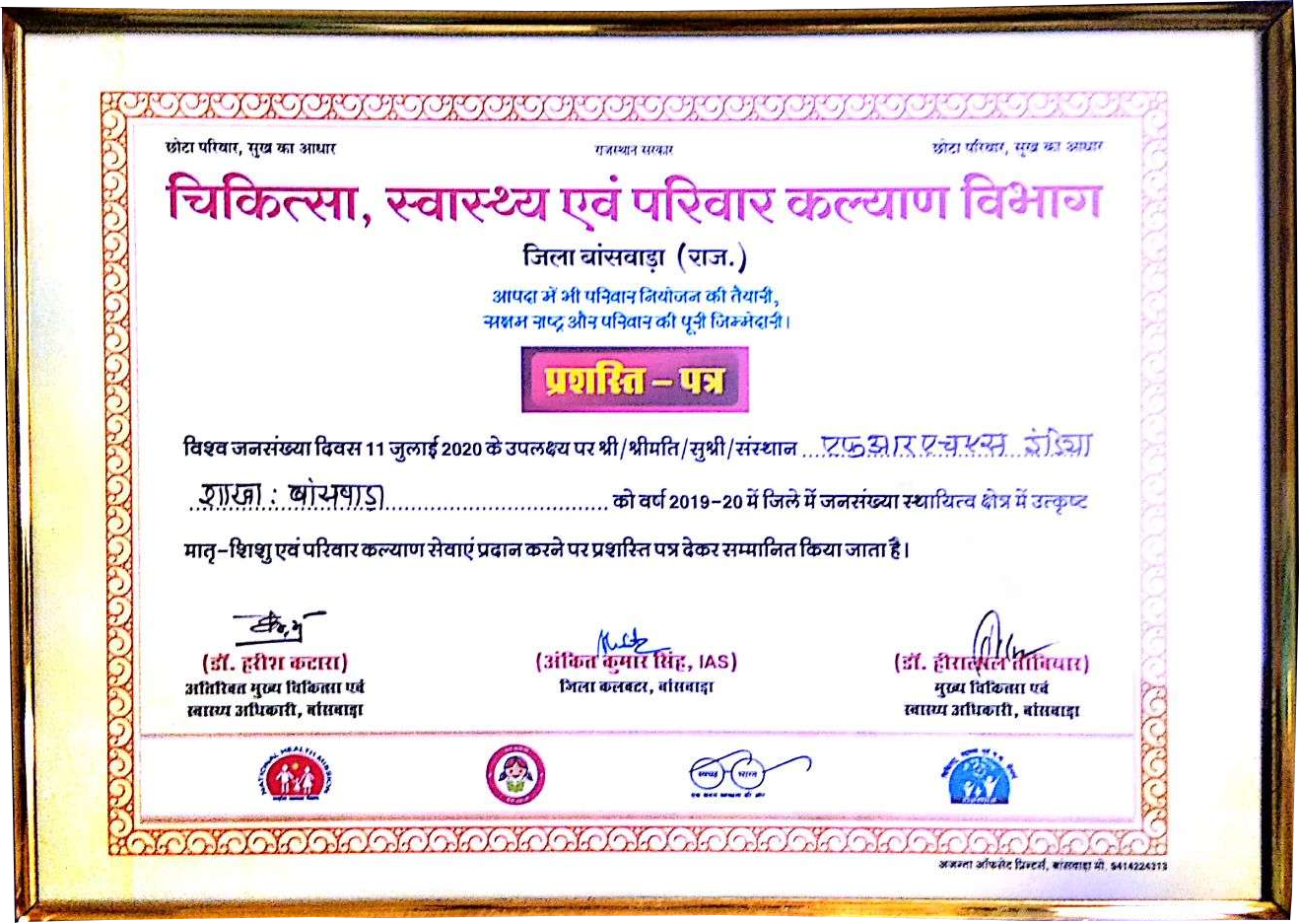FRHS India was awarded by Banswara Health Department (in Rajasthan) for our efforts in advancing family planning programme in the state. The ceremony was a part of the state’s fortnight-long family planning celebration. FRHS India received the award on 22 July, 2020.