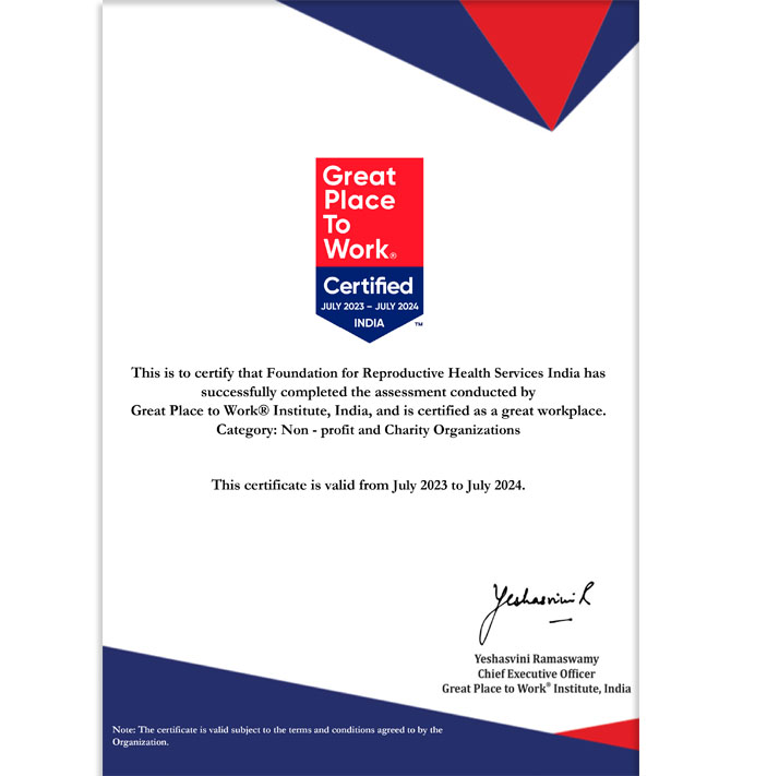 Foundation for Reproductive Health Services India has received top honours from MSI Reproductive Choices in October 2020. FRHS India has been a proud recipient of the Gold Award in the Excellence in Clinical Standards conferred by global CEO Mr Simon Cooke through a virtual ceremony.