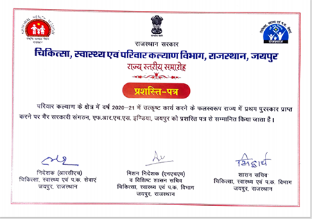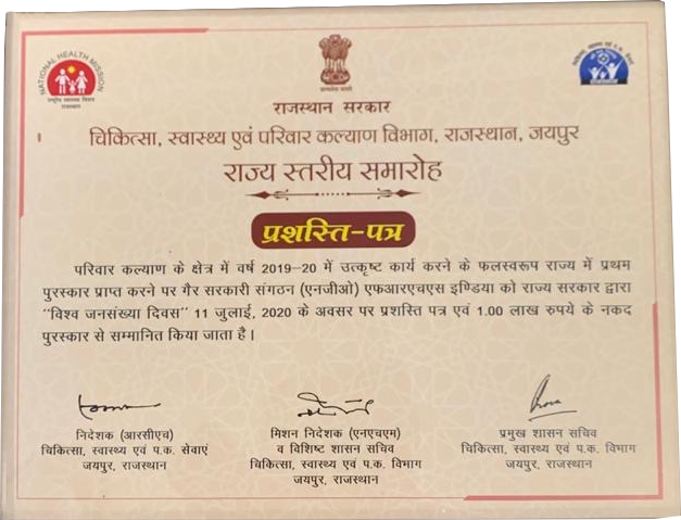 FRHS India has been the recipient of the ‘Best NGO in Family Planning Award’ for nine years in a row beginning 2012. The annual award is presented by the Government of Rajasthan, to recognise the contribution of NGOs in the state. The award was presented on the occasion of the World Population Day on 11th July, 2020 in Jaipur.
